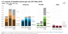 The United States became a net exporter of liquified natural gas in 2016. Principal markets for US LNG are Mexico, South Korea, China, and Japan.[47] In late 2021, U.S. producer Venture Global LNG signed three long-term supply deals with China's state-owned Sinopec to supply liquefied natural gas.[48] China's imports of U.S. natural gas will more than double.[49] U.S. exports of liquefied natural gas to China and other Asian countries surged in 2021, with Asian buyers willing to pay higher prices than European importers.[50]