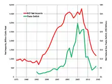 The cost of net imports peaked at US$29.7 billion in 2005; the cost of net imports was $5.9 billion in 2014.