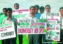 Nature's Beckon staging a demonstration. In 2003, UK based Premier Oil was permitted by the forest department to explore oil in the interior of the rainforests. It was later shut down due to the activism of Nature's Beckon