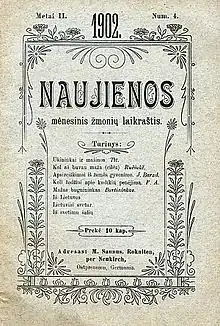 Naujienos (literally: News) was a short-lived Lithuanian-language monthly newspaper published by editorial staff of Varpas and Ūkininkas. Due to the Lithuanian press ban in the Russian Empire, the newspaper was published in Tilsit (now Sovetsk) in East Prussia and then smuggled to Lithuania by knygnešiai. In 1903, its circulation was around 1,500.[1]