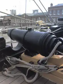 The earlier method of firing a cannon was to apply a linstock—a wooden staff holding a length of smoldering match at the end—to the touch-hole of the gun. This was dangerous and made accurate shooting difficult from a moving ship, as the gun had to be fired from the side to avoid its recoil, and there was a noticeable delay between the application of the linstock and the gun firing.[1] In 1745, the British began using gunlocks (flintlock mechanisms fitted to cannon).