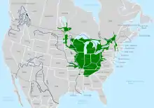 Necturus maculosus specimens live in streams, lakes, and ponds in the eastern part of North America.[4] They appear in the southern section of Canada, as far south as Georgia, and from the Midwest United States to North Carolina. Behaviorally, they hide under cover such as rocks and logs during the day and become more active at night.[7] However, in muddy waters, the mudpuppy may become active during the day.[3] Mudpuppies can even live under the ice when lakes freeze.[3] There is an introduced population in Maine.[13]