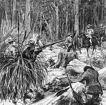 The police had received information that the Kelly gang were in the Wombat Ranges at the head of the King River and, on 25 October 1878, two mounted police parties were dispatched to search for them. One party, consisting of Sergeant Michael Kennedy and constables Michael Scanlan (sometimes spelled Scanlon), Thomas Lonigan and Thomas McIntyre camped overnight in an abandoned mining site at Stringybark Creek, about twenty-five miles north of Mansfield.[48] They were unaware that they were only 1.5 miles from the Kelly gang's hideout[49] and that Ned had observed their tracks.[48]