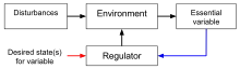 One use of feedback is to make a system (say T) self-regulating to minimize the effect of a disturbance (say D). Using a negative feedback loop, a measurement of some variable (for example, a process variable, say E) is subtracted from a required value (the 'set point') to estimate an operational error in system status, which is then used by a regulator (say R) to reduce the gap between the measurement and the required value.[8][9] The regulator modifies the input to the system T according to its interpretation of the error in the status of the system. This error may be introduced by a variety of possible disturbances or 'upsets', some slow and some rapid.[10] The regulation in such systems can range from a simple 'on-off' control to a more complex processing of the error signal.[11]