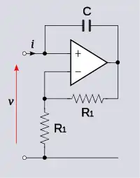 The negative of any impedance can be produced by a negative impedance converter (INIC in the examples below), including negative capacitance and negative inductance.[1] NIC can further be used to design floating impedances - like a floating negative inductor.[2][3]