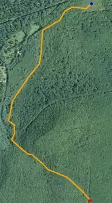 Satellite map of Negro Hollow. The red dot is the stream's source and blue dot is its mouth.