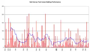 From there on, Harvey's series was unproductive, failing to pass 31 in the six innings of the final three Tests. Australia's form slumped along with that of Harvey, losing the next two Tests and the series 3–1. Harvey ended with 354 runs at 44.25 for the series.[14] Despite this, he continued to productive in the other first-class matches and was by far the most productive batsman in the 1954–55 Australian season, accumulating 1100 at 47.83 runs ahead of Les Favell's 663.[72] He scored a pair of 62s in a 36-run win over New South Wales, 95 and 66 against Queensland and 82 and 47 in a match for a Tasmania Combined XI against England.[8]