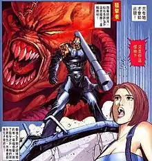 The Nemesis appears in a 1999 Hong Kong manhua adaptation of Resident Evil 3 by Lee Chung Hing, Biohazard 3: Last Escape, which is named after the game's Japanese title. The 27-issue series adds to the Nemesis' backstory, detailing its origin by showing the infection and transformation of the original Tyrant by the Nemesis parasite. Some elements are changed for its design, such as the Nemesis retaining both eyes initially, and then losing the right eye and gaining cranial staples only after an encounter with Jill.[50] The comic also introduces characters from Resident Evil 2 into the storyline, which results in several face-offs between the Nemesis and the mutated William Birkin throughout the series. During these fights Nemesis remembers before being experimented on his life as a boxer whose family had been infected and killed by a sadistic Umbrella executive. Encountering the man after defeating Birkin, Nemesis bites his head clean off in a fit of rage.[51]