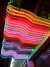 In the signage industry, neon signs are electric signs lighted by long luminous gas-discharge tubes that contain rarefied neon or other gases. They are the most common use for neon lighting, which was first demonstrated in a modern form in December 1910 by Georges Claude at the Paris Motor Show.[1] While they are used worldwide, neon signs were popular in the United States from about the 1920s to 1950s.[2] The installations in Times Square, many originally designed by Douglas Leigh, were famed, and there were nearly 2,000 small shops producing neon signs by 1940.[3][4] In addition to signage, neon lighting is used frequently by artists and architects,[3][5][6] and (in a modified form) in plasma display panels and televisions.[7][8] The signage industry has declined in the past several decades, and cities are now concerned with preserving and restoring their antique neon signs.
