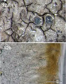 | Image of holotype specimen, showing a) habit and b) an ascus with ascospores. Scale bars: 1 mm (a), 10 µm (b) | |