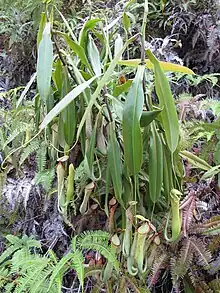 Nepenthes macrovulgaris (/nɪˈpɛnθiːz ˌmækroʊvʌlˈɡɛərɪs/; from Greek macro- "large" and Latin vulgaris "common, usual"), or the serpentine pitcher-plant,[4] is a tropical pitcher plant endemic to Borneo. It is a lowland plant that typically grows at altitudes ranging from 300 to 1200 m in sub-montane forest clearings and mossy forest. Its range is restricted to ultramafic habitats, including Mount Kinabalu, Mount Tambuyukon, the Danum Valley, the Tawai Range, the Meliau Range and Mount Silam, all in Sabah, Malaysian Borneo. Pitchers grow to around 25 cm high and range in colour from green to brown, with the speckled form being the most common.[5][6][7]