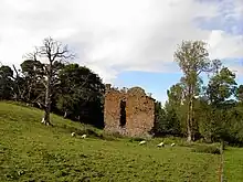 Only three walls still survive, reaching a height of about 12 metres (39 ft), with the east wall being completely ruined to ground level. The existing structure appears to have measured about 10 metres (33 ft) by 8 metres (26 ft), with walls of about 1.2 metres (3.9 ft) thick. It is thought that the tower rose to a height of four stories, with an entrance situated at ground level on the northeast side of the building. This led into a vaulted cellar, studded with slit window apertures. Evidence suggests that access to the upper floors was gained by a staircase situated in the east wall.