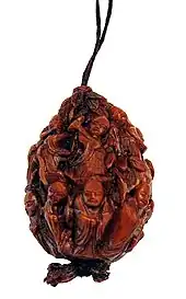 - Walnut (or kurumi – natural walnut shell): in the above photo, a rare example of the kataborinetsuke style, the meat from the nut was removed by various means, one being the insertion of a small worm in a hole in the nut to consume the meat. Following that, elaborate designs were carved, and the string inserted. The carver often removed all of the nut's normal surface features and carved through the surface in places to create a latticed effect. Once carved, the resulting netsuke was polished and shellacked.