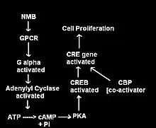 When NMB binds to its 7-TMR, the heterotrimeric G protein that is attached to the receptor is activated. The G-protein is called heterotrimeric because it consists of 3 polypeptides: α subunit, β subunit, and γ subunit. In the activated NMBR/G-protein complex, there occurs an exchange of GTP for GDP bound to G-α subunit. The G-α subunit, in turn, dissociated form the G-βγ subunits. The free G-α inactivates adenylate cyclase (AC), which, in turn, catalyzes the conversion of ATP to cAMP, the latter of which functioning as a second messenger. cAMP activates of the enzyme Protein Kinase A (PKA). PKA enters the nucleus and activates the cAMP response element-binding protein. The activated CREB binds along with CREB binding protein, co-activator to the CRE region of the DNA in the nucleus. CREB and CBP are held together by leucine zippers. CRE is the control that activates number of growth factors, and thus cell proliferation and some anti-apoptotic genes. In the brain, CREB plays a role in long-term memory and learning.