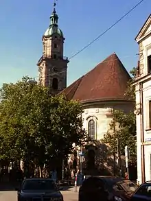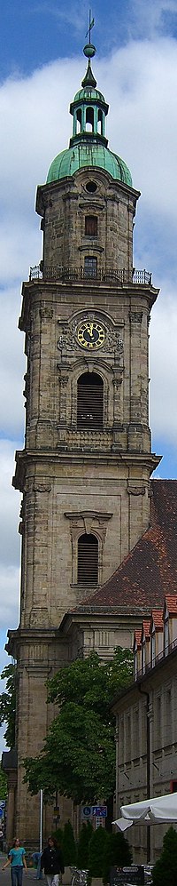 Neustädter Kirche (new town church) is one of three large downtown churches of the Baroque old town of Erlangen. Germany. The church is Lutheran. It dominates the town, together with the Reformed Hugenottenkirche (church of the Huguenots) and the Lutheran Altstädter Kirche (old town church).