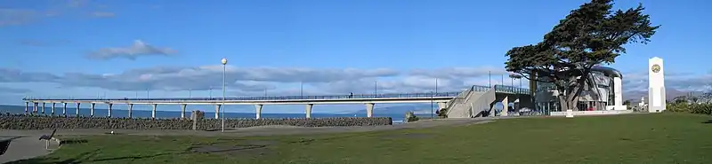 For 30 years, the New Brighton community rallied for another pier to be built. The Pier and Foreshore Society had campaigned to save the original pier, and the group continued lobbying for a new pier. When NZ$2m had been raised, this was matched by funding from Christchurch City Council and a new pier was designed using reinforced concrete. The new pier was built in exactly the same location, and was officially opened on 1 November 1997. It spans 300 metres (980 ft), which makes it the longest ocean pier in Australasia.[1] The New Brighton Pier is held as the icon of New Brighton and later the icon of Christchurch after the 22 February 2011 earthquake that significantly damaged Christchurch's Cathedral. The pier is one of Christchurch's tourist attractions. Currently the New Brighton Pier is the venue of a number of events, such as regular skate on the Pier events and the annual Guy Fawkes fireworks display held on 5 November every year. The pier sustained some damage in the various earthquakes, which was exacerbated in the 2016 Christchurch earthquake. Repairs started in February 2017, took 16 months, and cost NZ$8.5m. New Brighton pier reopened again in May 2018.[4]