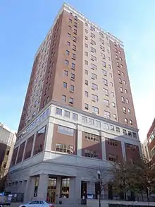 The six-story First Reformed Church, built in 1812 was long the city's tallest structure.[85] One of the earliest tall commercial buildings in the city was the eight-story 112.5 ft (34.29 m) National Bank of New Jersey built in 1908.[86][87] The 4 nine-story 125 ft (38 m) buildings of the New Brunswick Homes housing project, originally built in 1958, were demolished by implosion in 2000 and largely replaced by low-rise housing.[88][89][90]
