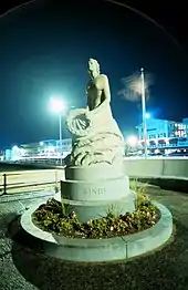 The statue depicts a kneeling woman gazing out to sea, a laurel wreath in her hands. Close by the statue is a quarter-circle of granite into which are cut the names of men lost to the sea.