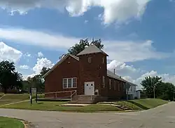 Its building is a one-story east-facing front-gabled red brick building and has a square corner tower. It has a concrete block education wing with a basement which was added at the rear in about 1948.[2]