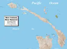 New Ireland (Tok Pisin: Niu Ailan), or Latangai, is a large island in Papua New Guinea, approximately 7,404 km2 (2,859 sq mi) in area with c. 120,000 people.[2] It is named after the island of Ireland. It is the largest island of New Ireland Province, lying northeast of the island of New Britain. Both islands are part of the Bismarck Archipelago, named after Otto von Bismarck, and they are separated by Saint George's Channel.
