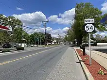 By 1927, what is now Route 54 was an unnumbered, unpaved road connecting Buena to Hammonton.[4] Route 54 was legislated on March 30, 1938, to run from US 30/Route 43 and US 206/Route 39 in Hammonton south along Lincoln Avenue to an intersection with Main Road in Landis Township, Cumberland County (now a part of Vineland).[2] The only portion of Route 54 that was taken over as a state highway was north of the US 40/Route 48 intersection in Buena.[5] The portion of Lincoln Avenue south of US 40 remained a county route called CR 25 in Cumberland County and CR 55 and CR 19 in Atlantic County.[6][7] This road is presently both Cumberland and Atlantic CRs 655 and a part of Atlantic CR 619.[8][9][10] In the 1953 New Jersey state highway renumbering, Route 54 was defined onto its current alignment between US 40 in Buena Vista and US 30/US 206 in Hammonton.[11][12] In the late 1960s, a freeway was proposed for the US 206/Route 54 corridor, running from US 30 in Hammonton south to Route 55 and the proposed Route 60 near Vineland and Millville.[13] The freeway between Vineland/Millville and Hammonton was to cost $47 million and was intended to provide a better route between the two areas than the existing two-lane roads. This proposed freeway was never built due to environmental and financial issues.[14]
