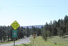 Crossing the Canadian River bridge the road enters Harding County and then heads north-northeast about 8 miles (13 km) into the town of Roy.[4] The road comes into Roy as the Wagon Mound Highway, then zags up to Second Street and then up to Third Street where it intersects with Route 39. Then heading three blocks east as Third Street, the road turns due north as Floersheim Street and leaves Roy as the Yates Highway. Running along section lines the road heads north and east intermittently, passing numerous ranch roads and going through part of the Kiowa National Grassland which is predominately north of the road,[6] for 27 miles (43 km) to the community of Yates. Four miles (6.4 km) later heading due north the road passes into Union County.[4] After 12 miles (19 km) in Union County headed mostly north, but still on section lines, the road terminates at its intersection with U.S. Route 56 and U.S. Route 412 8 miles (13 km) east of Gladstone.[4] A dirt road continues north at that point for a couple of miles into the Don Carlos Hills.[4]