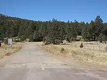 After mile marker 12, the road continues southeastward passing the unpaved Los Le Febres turnoff on the right (to the west).[2] At this point Manueles Creek on the left side of the road is joined by Wheaton Creek to form Ocate Creek, and the road follows Ocate Creek southeast[2] with the Maxwell Land Grant on the left (NE) and the Mora Land Grant on the right (SW). The road then enters the community of Ocate where it intersects with Route 442. Leaving Ocate again alongside Ocate Creek, the road heads east twisting through the foothills of Los Naranjos Peak to the south in the Ocate Creek water gap into the community of Naranjos.[2] From Naranjos the road leaves the Ocate Creek bed and heads almost straight southeast, passing numerous ranch roads, for 19 miles (31 km) to the town of Wagon Mound.[2] Ten miles (16 km) out of Naranjos, the road passes the 7,000 feet (2,100 m) in elevation, La Chata Crater, on the left (NE).[4] Just before the town the road turns east and still on the west side of Wagon Mound, it has its only interchange at its intersection with I-25 (exit 387). The road then crosses the intercontinental railroad tracks of the BNSF Railway.[4] Within Wagon Mound the road heads east and is called Park Avenue. Leaving Wagon Mound, the road again passes numerous ranch roads heading east, past Los Mesas del Conjelon on the right (south),[4] for about 12 miles (19 km) and then heading southeast another 12 miles (19 km) to its intersection with the Canadian River at mile post 64. The bridge over the river is 4,150 feet (1,260 m) long.[5]