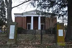 New Providence Presbyterian Church is a historic Presbyterian church located at Brownsburg, Rockbridge County, Virginia. It was built in 1859, and is a monumental, one-story Greek Revival style brick building. Rev. Robert Lewis Dabney (1820-1898) may have had a hand in the design of New Providence. The front facade features a central recessed portico marked by slightly projecting flanking piers and a similarly projecting pediment supported on two massive, unfluted Doric order columns. In 1926 a three-story, brick Sunday School wing was added to the rear.[3]