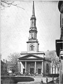 In 1814 a new building was constructed, designed by Charles Bulfinch, at a cost of 2,188 pounds.[7] It was built out of Chelmsford granite. "The first story of the steeple is an octagon, surrounded by 8 columns and a circular pedestal and entablature; an attic, above this, gradually diminishing by 3 steps of gradins, supports a second range of Corinthian columns with an entablature and balustrade from this, the ascent in a gradual diminution, forms the base of the spire, which is crowned with a ball and vane."[8] In the first half of the 19th century "Summer Street was, beyond dispute, the most beautiful avenue in Boston. Magnificent trees then skirted its entire length, overarching the driveway with interlacing branches, so that you walked or rode as within a grove in a light softened by the leafy screen" of elms.[1] Inside the church, the organ was built by Thomas Appleton.[9]