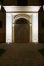 The first level: ground floor in the middle of the body (4 axis), has a small flat roof porch with the main portal. The portal has fanlight, flanked by half-columns with smooth shafts. The capitals with cornices are decorated palmettes. The portal is closed with a full arc, archivolts geometrically ornamented with triangles. Fortunately, this molding was known from the side portals. The auxiliary arches are decorated with palmettes with volutes. This motif was also seen on the fragments of the side portals. The porch plaster is split with horizontal and vertical lines, creating a framework. The porch's corners are visibly projecting forward.