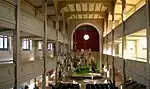 The one room rectangular main prayer hall has wooden semicircle arches and arcades, a two-level gallery with flat ceilings for women. Decorative painting depicting geometric and foliage motifs were scarcely preserved. The eastern wall was originally richly decorated with Aron Kodesh which was enclosed in an interior size frame finished with a semicircular arc. A rosette lined with blue and gold rays and rings was preserved on that wall. Most of the equipment of the synagogue was removed by the Communists. Dim light used to come through stained glass oculus in the front and rear facades and the ox-eye windows placed high on the side facades.