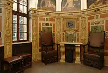 The Fireplace Room (Kaminsaal) is used for receptions. It takes its name from the tall French marble fireplace. A white stucco ceiling, dark red damask wallpaper, large 17th-century portraits and crystal chandeliers contribute to the character of the room.