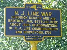 The New York – New Jersey Line War (also known as the N.J. Line War) was a series of skirmishes and raids that took place for over half a century between 1701 and 1765 at the disputed border between two American colonies, the Province of New York and the Province of New Jersey.