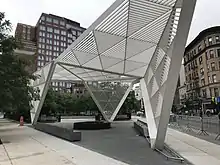 The New York City AIDS Memorial is a public memorial in Greenwich Village, Manhattan, New York City built "to honor New York City's 100,000+ men, women and children who have died from AIDS, and to commemorate and celebrate the efforts of the caregivers and activists."[1][2] It is the first major space that is dedicated to the epidemic in New York City.[1] The memorial was opened on World AIDS Day on December 1, 2016. The design was developed by the efforts of nearly 500 architects who came up with the idea of an 18-foot steel canopy as the gateway to the new St. Vincent's Hospital Park in Greenwich Village.[3][4]