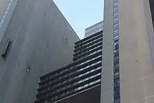 The facade is made of gray precast concrete panels with vertical stripes, which were manufactured by Canadian company Prefac-Vibrek. The lower stories' panels were installed using cranes, while the upper stories' panels were installed with a monorail assembly.[31] The precast panels are hung from steel beams that are placed around the hotel building's perimeter. Some openings were also made in the facade so exterior signs could be attached to it.[29] The windows are recessed deeply into the concrete panels, a design similar to a Venetian blind.[30]