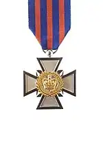 | Description | 45 mm, (obverse) cross pattée surmounted by a small faceted four-pointed star with the Royal Crown and fern frond wreath emblem; (reverse) inscribed "FOR BRAVERY - MO TE MAIA". With ring suspension. |