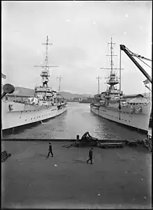 HMS Diomede and HMS Dunedin berthed in Wellington, ca 1928