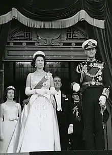 A new parliamentary session is marked by the Opening of Parliament, during which the governor-general reads the Speech from the Throne, on the King's behalf. This speech is given at the start of every new Parliament, and explains why Parliament has been assembled. It outlines the Government's legislative agenda.[44] On occasion, the monarch may open Parliament and personally deliver the speech; for example, Queen Elizabeth II personally attended the Opening of Parliament in 1954 (to mark the legislature's centenary),[1][58] and more recently in 1986 and 1990.[59][60]