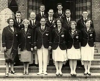 front (l–r): Annie Miller (chaperone), Mrs Amos (chaperone), Harry Amos (Chef de Mission), Ena Stockley, Kathleen Miller, Norma Wilson