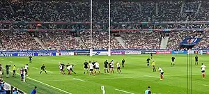 The 2007 season started off with two mid-year tests against France. New Zealand won the tests 42–11 at Eden Park and 61–10 at Westpac Stadium. A third game, against Canada, resulted in a 64–13 win, although the game was more competitive than the scoreline indicated.[113] New Zealand's first Tri-Nations game of 2007 was against the Springboks in Durban, South Africa. New Zealand scored two tries in the final fifteen minutes of the game to win 26–21.[114] The following week against the Wallabies at the Melbourne Cricket Ground the Wallabies upset New Zealand to win 20–15.[115] The All Blacks won their following home games to successfully defend the Tri-Nations Series for 2007.[116][117] New Zealand entered the 2007 Rugby World Cup as favourites,[118] and topped their pool,[119] beating Scotland, Italy, Romania and Portugal by at least 40 points. However, they then suffered a defeat by hosts France in the quarter-finals in Cardiff.[120] Following the loss to France coach Graham Henry's job was reappointed amid vocal debate and comment, despite Robbie Deans being a strong contender.[121]