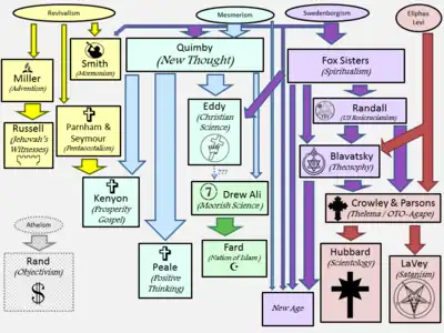 Swedenborgism influenced the Fox Sisters's Spiritualism as well as Joseph Smith's Mormonism.[7][8] Spiritualism influenced Paschal Beverly Randolph founder of Fraternitas Rosae Crucis, and Helena Blavatsky, the founder of Theosophy. Blavatsky was influenced by the work of Éliphas Lévi.[9] Aleister Crowley and Jack Parsons's Thelema were influenced by Theosophy and Levi. Thelema influenced Anton LaVey's Satanism and L. Ron Hubbard's Scientology.[10]