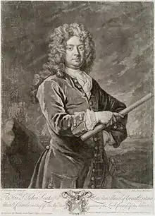 Hostilities in the War of the Spanish Succession had begun in 1701, but England did not get involved until 1702, planning a major naval expedition against targets in Spain.[1] On 9 June 1702 (Old Style)[2] Newfoundland also became a target when George Churchill, chief advisor to the Lord High Admiral, Prince George, informed Captain John Leake, "I have proposed to the Prince, your going to command a squadron to Newfoundland; you will be a Chief of Squadron".[3] Leake's commission, issued on 24 June, came with instructions to investigate the military strength of the French in Newfoundland, and to "annoy them there in their fishing harbours and at sea". He was also to convoy merchant ships in both directions, report on the conditions of the English settlements and fisheries, and act as governor of the territory while he was there.[4] To accomplish this he was given command of HMS Exeter and a small fleet of ships. On 22 July 1702, he departed from Plymouth with a fleet of nine ships, including six ships of the line. His ships included (in addition to Exeter) the fourth rates HMS Assistance, HMS Montagu, HMS Lichfield, HMS Medway, and HMS Reserve.[5]