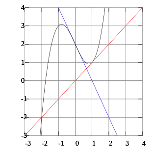 The tangent lines of x3 − 2x + 2 at 0 and 1 intersect the x-axis at 1 and 0 respectively, illustrating why Newton's method oscillates between these values for some starting points.