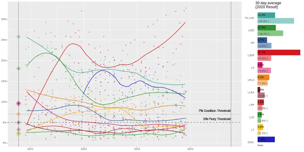 | Baltijos tyrimai | 23 October – 7 November 2023 | 1,013 | 11.9 | 14.1 | 9.7 | 25.9 | 2.8 | 9.9 | 1.4 | 4.6 | 1.4 | 3.5 | 13.6 | 11.8 |