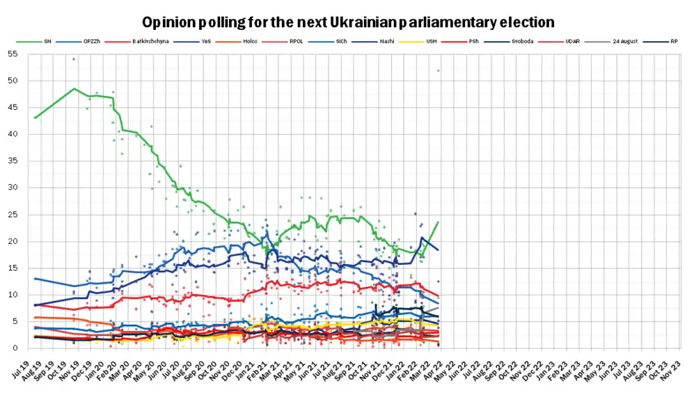 On 20 March 2022, the activities of several political parties were suspended by the National Security and Defense Council of Ukraine for the period of martial law:[25][26]