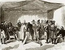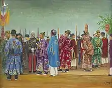 The war between the Nguyễn lord and the Tây Sơn dynasty forced Ánh to find more allies. His relationship with de Behaine improved, and support for an alliance with France increased. Before the request for Siamese military assistance, de Behaine was in Chanthaburi and Ánh asked him to come to Phú Quốc Island.[47] Ánh asked him to contact King Louis XVI of France for assistance; de Behaine agreed to coordinate an alliance between France and Vietnam, and Ánh gave him a letter to present at the French court. Ánh's oldest son, Nguyễn Phúc Cảnh, was chosen to accompany de Behaine. Due to inclement weather, the voyage was postponed until December 1784. The group departed from Phú Quốc Island for Malacca and thence to Pondicherry, and Ánh moved his family to Bangkok.[48] The group arrived in Lorient in February 1787, and Louis XVI agreed to meet them in May.