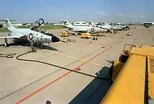 In January 1954, the 107th received its first jet aircraft (F-94 Starfire, followed by F-86 Sabres in October 1957 & F-100C Super Sabre in August 1960). The Air Force Reserve's 445th Fighter-Bomber Group with F-84 Thunderjets moved to Niagara Falls from Buffalo Airport on 15 June 1955 and moved to Memphis on 16 November 1957. Two 15th FG aircraft--T-33 & F-86 at Niagara Falls Air Force Base—collided in 1956,[9] the AFB's medical unit treated injuries from a 1958 railcar explosion.[10] In 1959 a NFAFB helicopter crashed in Letchworth State Park searching for an 83-year-old professor emeritus,[11] and in 1961 an F-100 from the base crashed into the Niagara Gorge.[12]