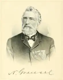 Nicholas Greusel was born on July 4, 1817, in Blieskastel which then belonged to the Kingdom of Bavaria. He received an education in the German and French languages. In 1833, his parents and siblings emigrated to New York City in the United States. His father told the eight older children, including Nicholas that they were on their own. Nicholas found employment for a year with the mother of Hamilton Fish, and for a second year worked in a brickyard. His entire family moved again, arriving in Detroit, Michigan Territory on November 1, 1836. Greusel got a job in the lumbering business which he kept for the next decade. During this time he became captain of a militia company and later major in the Frontier Guards. Greusel married Jane Doumens in 1839; they would have 12 children of whom eight were living in 1888. In 1844, he was elected Alderman of the Fourth Ward of Detroit as a member of the Whig Party and served for two years.[1]