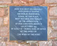 Nicholas Radford (c. 1385 – 23 October 1455) of Upcott in the parish of Cheriton Fitzpaine,[2] and of Poughill, Devon, was a prominent lawyer in the Westcountry who served as Member of Parliament for Lyme Regis, Dorset (May 1421) and Devon (1435). During the anarchic times of the Wars of the Roses he was caught up in the dynastic Westcountry rivalry between Thomas de Courtenay, 5th Earl of Devon, of Tiverton Castle, for whom during his minority he had acted as steward, and William Bonville, 1st Baron Bonville, of Shute. His murder in 1455 by the Earl's faction "ranks among the most notorious crimes of the century",[3] and was the precursor of the Battle of Clyst Heath (1455) fought shortly thereafter near Exeter by the private armies of the two magnates. He served as a Justice of the Peace for Devon (1424-1455), as Escheator for Devon and Cornwall (1435-6), Recorder of Exeter (1442-1455) and as Tax Collector for Devon in 1450 and as Apprentice-at-law for the Duchy of Lancaster (1439-1455).[4]