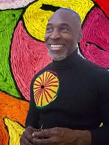 Nick Cave (born February 4, 1959) is an American sculptor, dancer, performance artist, and professor.[1] He is best known for his Soundsuit series: wearable assemblage fabric sculptures that are bright, whimsical, and other-worldly, often made with found objects. He also trained as a dancer with Alvin Ailey and often incorporates dance and performance into his works.[2] His later sculptures have focused on color theory and included mixed media and large-scale installations. He lives in Chicago, Illinois, and directs the graduate fashion program at the School of the Art Institute of Chicago.[3] He continues to work on Soundsuits as well as works completed as a sculptor, dancer, and performance artist.[4]